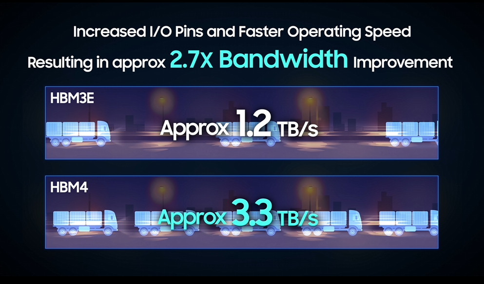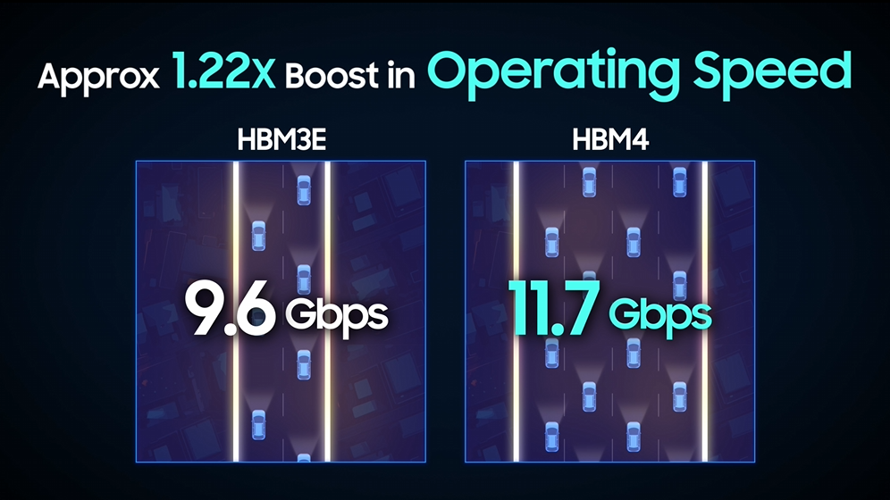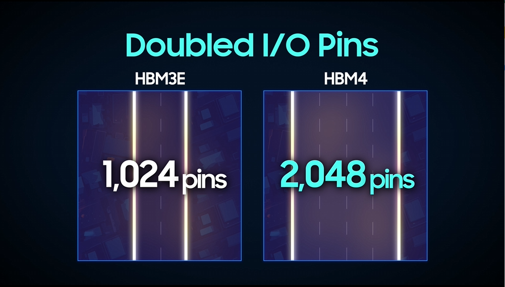 HBM4 features an expanded I/O interface of 2,048 pins — double the 1,024 pins of HBM3E — enabling a base data transfer rate of 11.7Gbps and a peak rate of up to 13Gbps. This translates to a total memory bandwidth of 3.3TB/s per stack, approximately 2.7 times that of HBM3E. For reference, this bandwidth is sufficient to transmit 750 full 4GB movie files per second, a capacity designed to address the data throughput demands of large-scale AI model training and inference.
