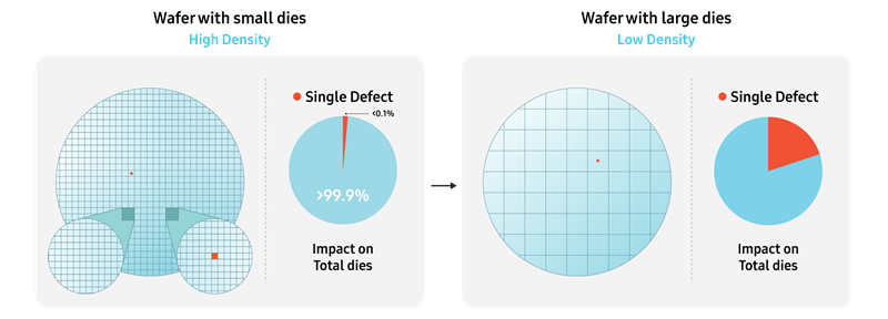 * 다이 크기가 커질수록(오른쪽) 결함 하나에도 전체 면적 대비 영향을 받은 다이의 면적이 커져 수율에 큰 영향을 주게 됨.