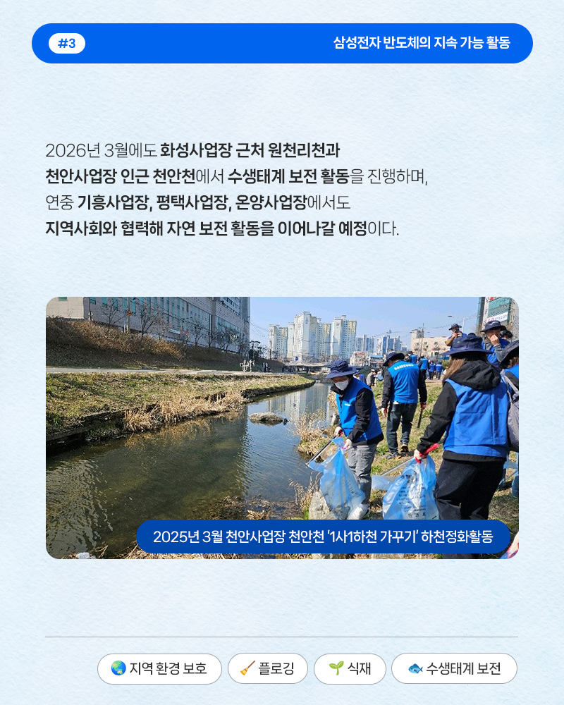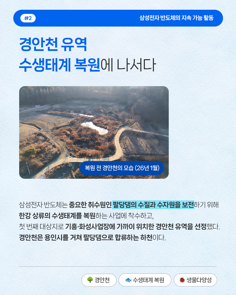 물은 삶을 지탱하는 필수 요소이자 반도체 산업의 핵심 자원이다. 반도체 생산 공정에는 많은 양의 물이 사용되기에 수자원의 안정적인 확보와 관리는 산업 경쟁력과 직결된다. 삼성전자 반도체는 공유 자원인 물의 이용 효율을 높이고 수생태계를 지속 가능하게 보존하기 위해 노력을 기울이고 있다. 3월 22일 ‘세계 물의 날’을 맞아, 삼성전자 반도체가 추진하고 있는 수자원 보전 활동을 살펴보자.