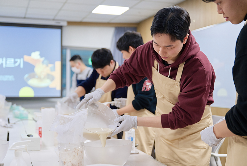 밥알 한 톨 한 톨을 정성스럽게 풀어가며, 막걸리 만들기에 집중하는 임직원들. 막걸리를 빚은 후에는 준비된 세 종류의 전통주를 맛보는 시음회도 진행됐다. 단순한 체험을 넘어, 전통주가 가진 매력을 몸소 느낄 수 있는 시간이었다.