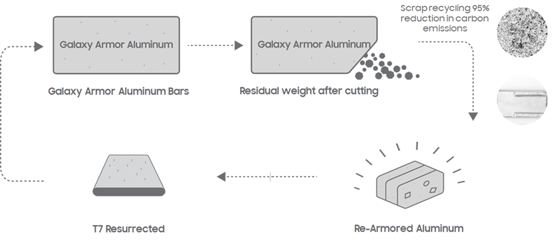 정상진 님: T7 Resurrected는 삼성의 대표 포터블 SSD인 T7에서 파생된 제품으로, 자원 선순환을 고려해 개발한 모델입니다. 스마트폰 생산 과정에서 발생하는 알루미늄 스크랩을 활용한 첫 시도가 T7 Shield였다면, 이번에는 재생 알루미늄 100%로 외장 케이스를 제작하고, 환경 부담을 낮출 수 있는 재생 종이를 포장재에 적용했습니다.