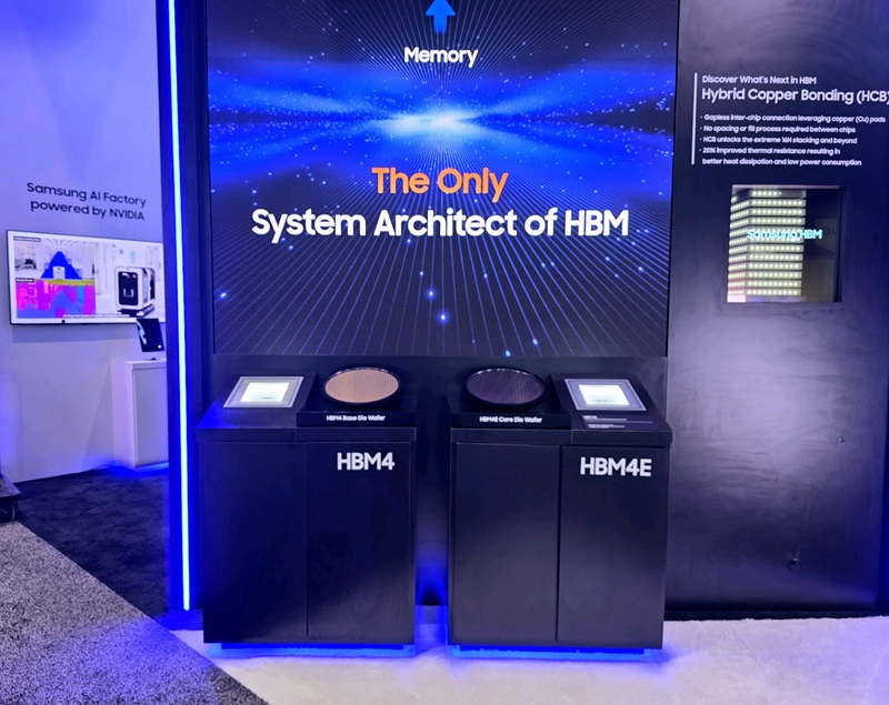 삼성전자는 이번 GTC에 마련된 전시 부스에 ‘HBM4 Hero Wall’을 마련해, HBM 기술 리더십을 조명했다. 지난 달 양산 출하를 발표한 HBM4를 비롯해 차세대 HBM4E 실물 칩과 코어 다이 웨이퍼도 최초로 공개했다.